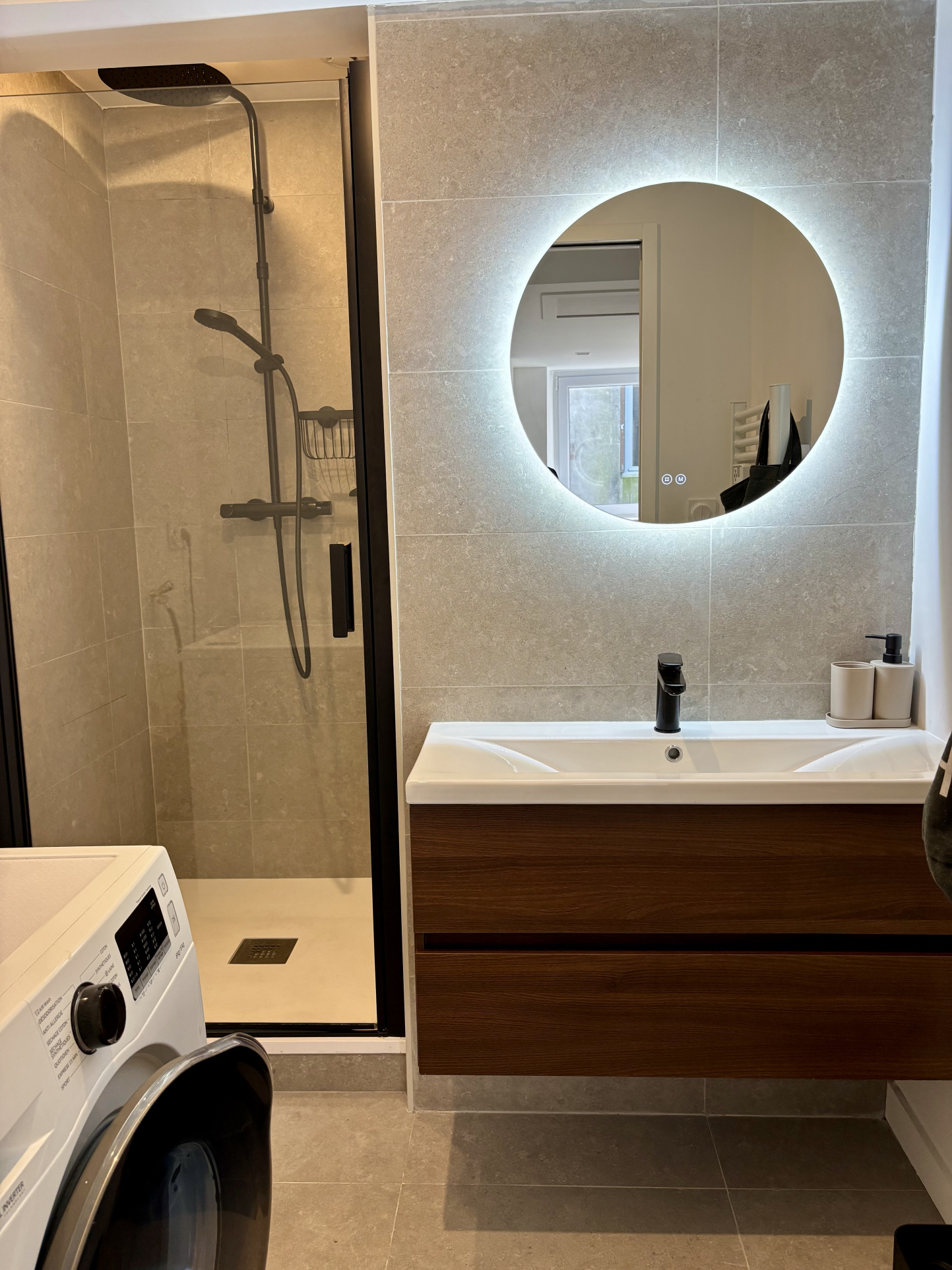 Il dispose également d'une chambre avec placards et d'une salle de douche avec lave linge. Un wc avec lave mains indépendant.