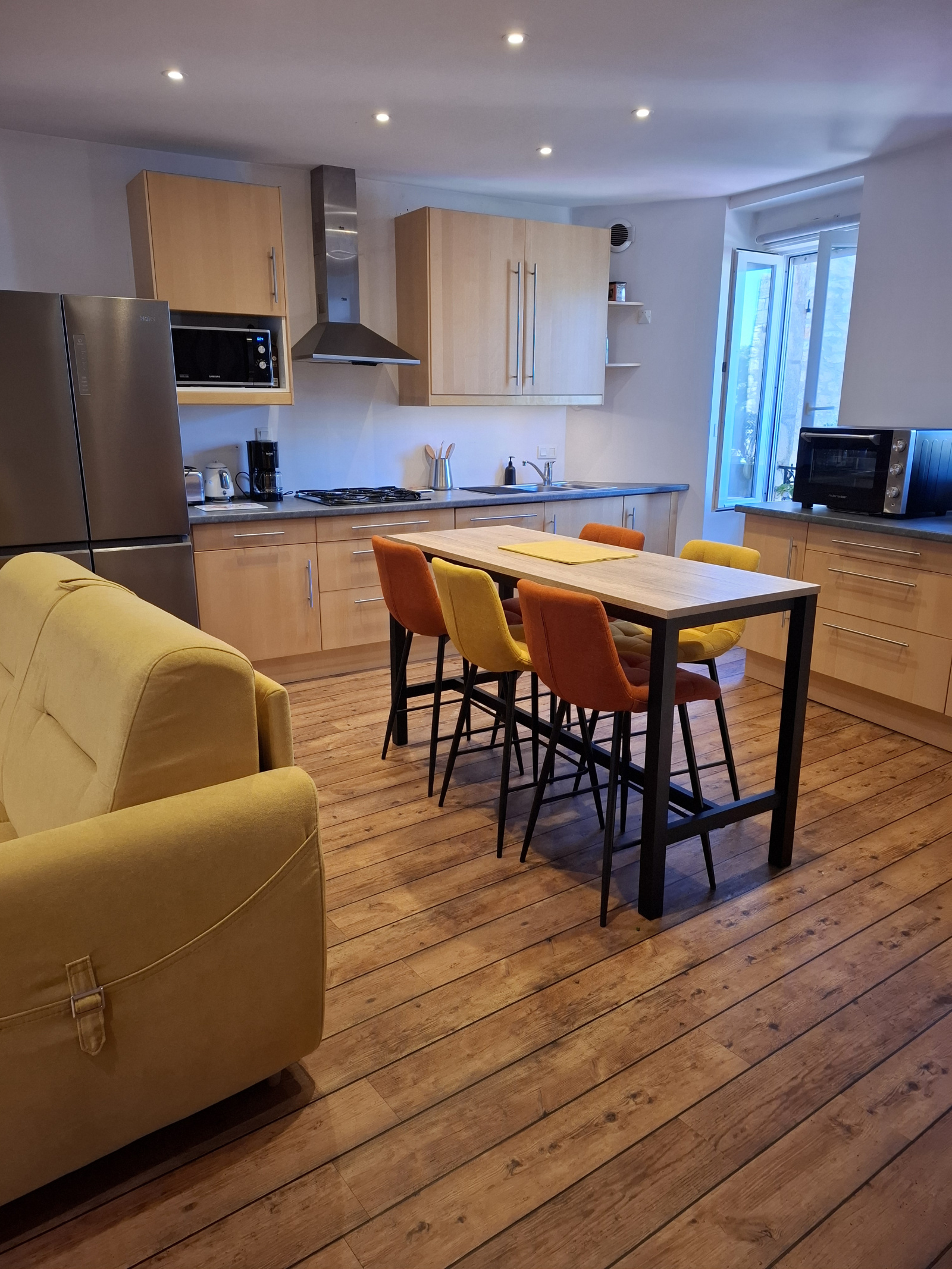 L'escalier mène à une belle pièce de vie lumineuse, exposée Sud, composée d'un espace salon et d'une cuisine ouverte aménagée et équipée proposant un coin repas.