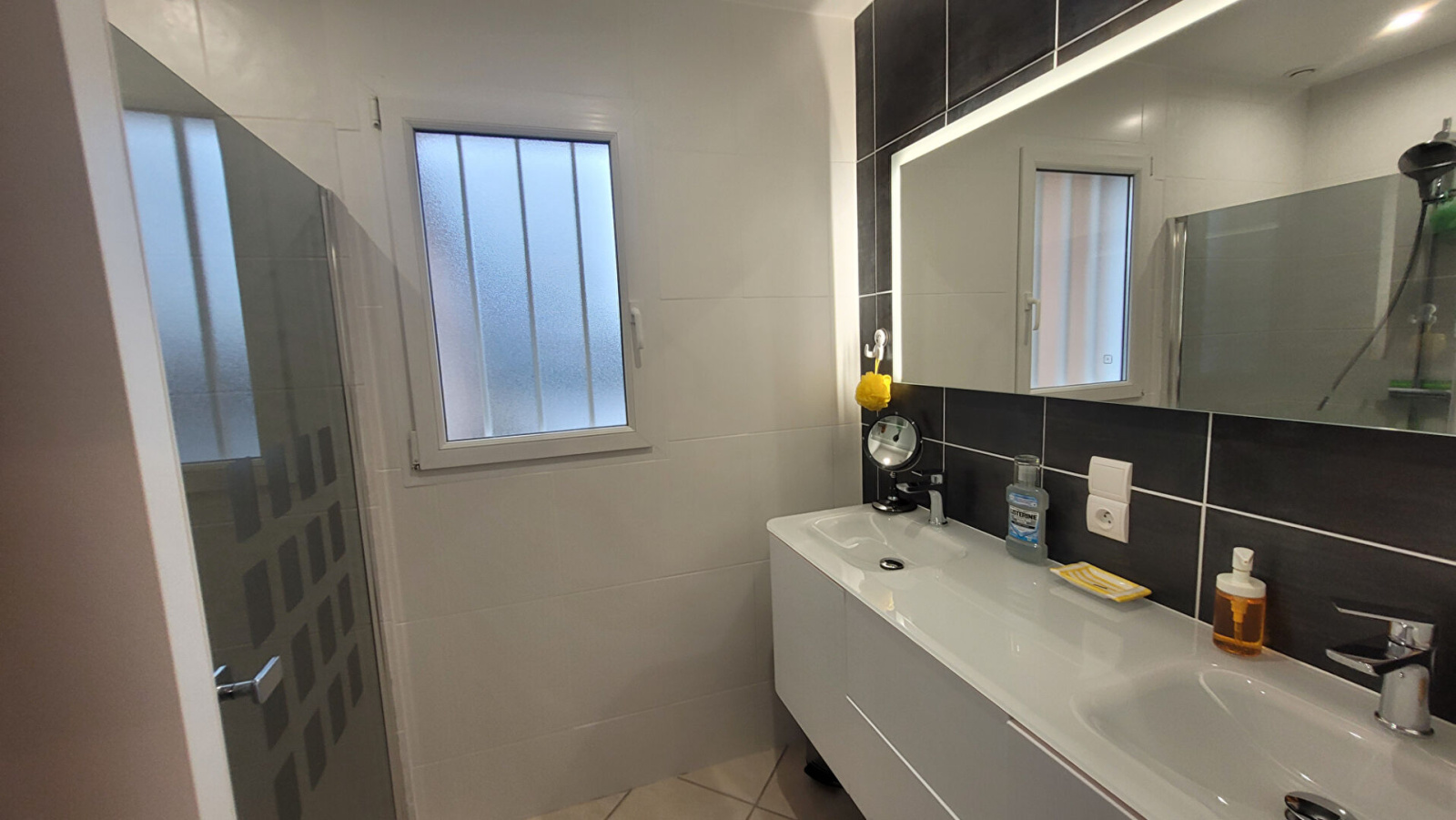2 vasques, douche et baignoire, Sol : Carrelage